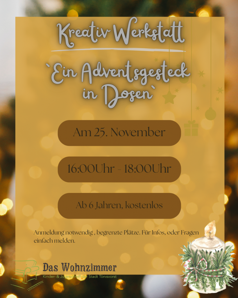 Anmeldungen ab sofort per, Anruf 02156 971 960, Mail info@daswohntimmer-toenisvorst.de, oder persönlich in der Einrichtung Kinder- und Jugendtreff `Das Wohnzimmer`Gerkeswiese 40 47918 Tönisvorst…