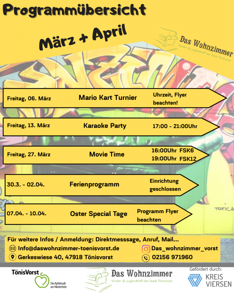 Der Kinder- und Jugendtreff „Das Wohnzimmer“ bietet diverse Veranstaltungen für alle Altersstufen (von 6 – 27 Jahren) und zu vielen verschiedenen Themenbereichen an. In der Veranstaltungsübersicht sind alle kommenden Veranstaltungen und Aktionen aufgelistet.